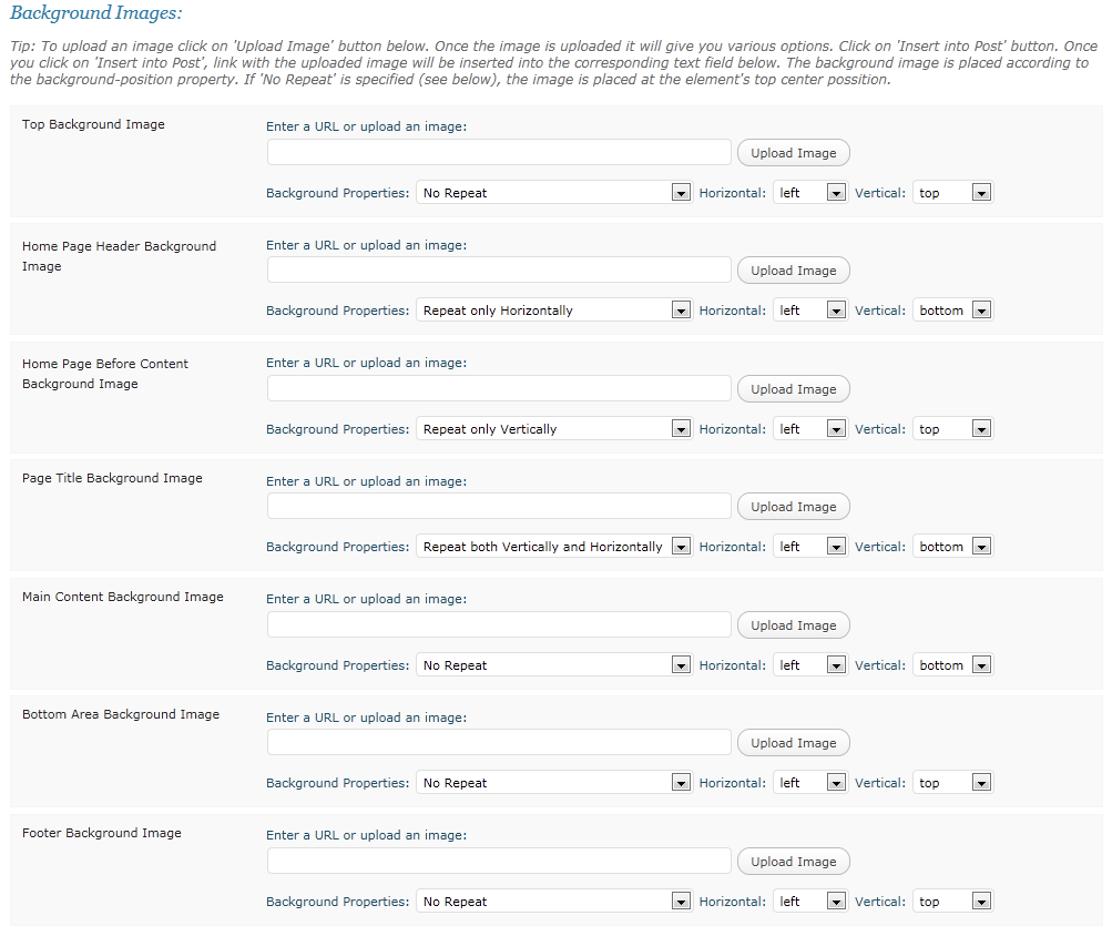 You could also upload background images on per section bases instead of solid background color if you wish. Upload your images or reference a link directly to the image. You’ll also be able to position the images in variety of configurations: from a single background image to repeating tiled images, it is up to you: