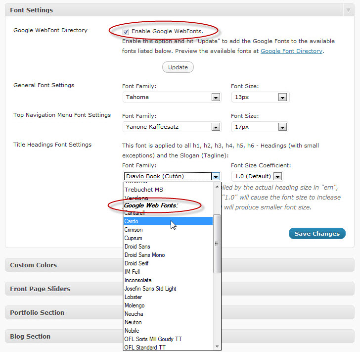 Choosing fonts for your website has never been easier. I’ve added Google Fonts as an alternative to Cufón fonts. One of the advantages of using Google fonts is that the actual fonts are served from an online directory the first time the users browser requests them and then cached locally. This eliminates the requirement to have the fonts available on the user’s machine in the first place. Another advantage of Google fonts is that they are not JavaScript dependent and they are selectable as opposed to non-selectable for Cufón fonts. As new fonts are being added by Google to the online directory I will be updating the theme’s list of fonts over time.